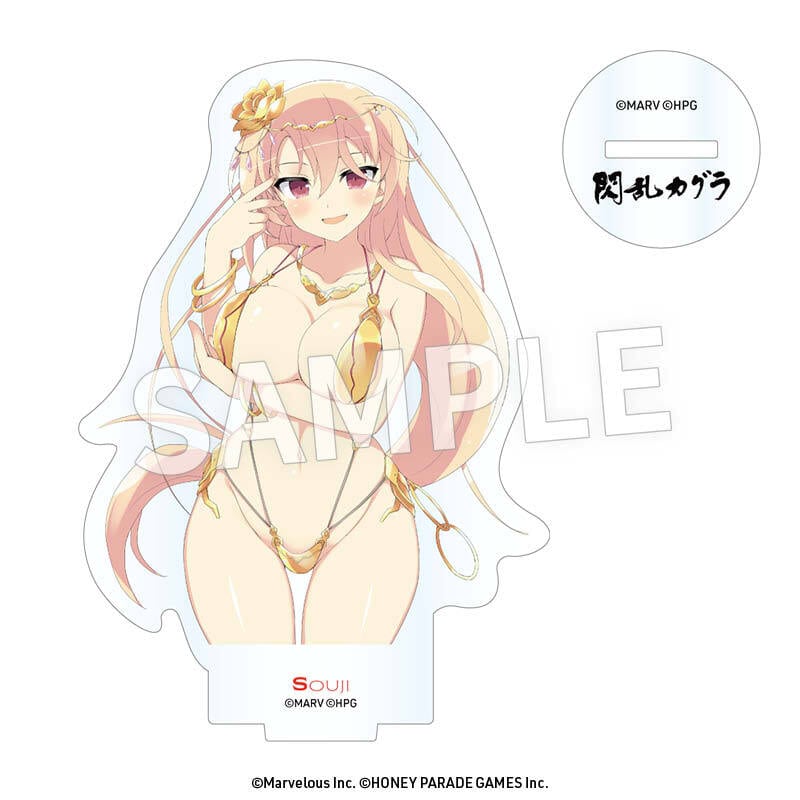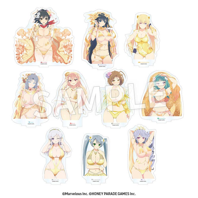 絢爛豪華──黄金の水着をまとったヒロインたちの立ち絵イラストを使用し、キャラクターのシルエットに沿ってダイカットした仕様です。
